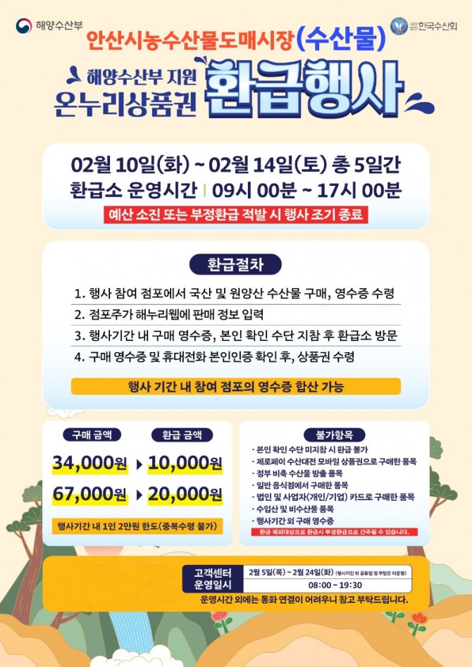 이미지 확대보기이번 행사는 안산시농수산물도매시장 수산동에서 진행되며, 행사 기간 중 국산수산물을 구매한 소비자에게 구입 금액의 최대 30%를 온누리상품권으로 환급해 주는 방식으로 운영된다.