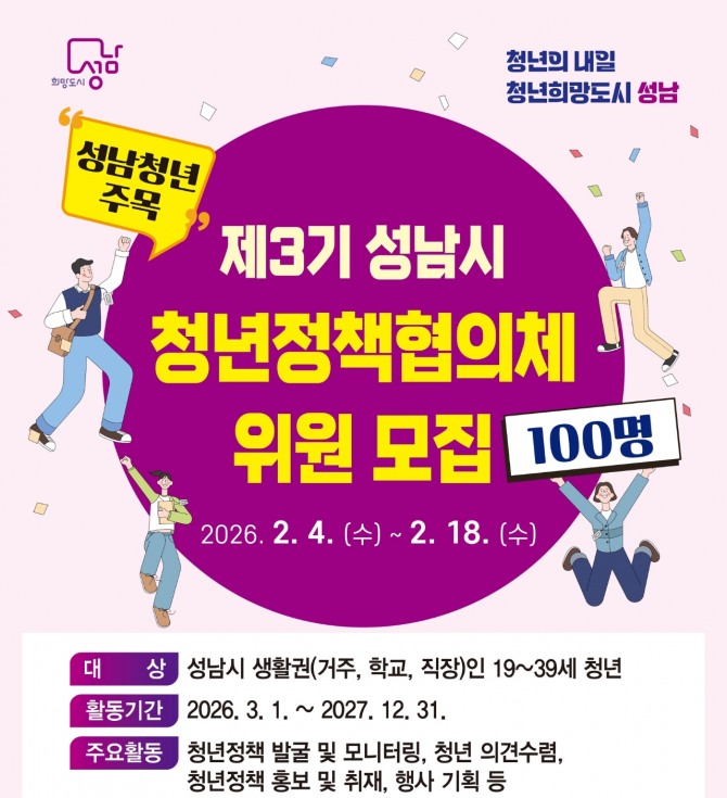 참여 자격은 성남시에 거주하거나 지역 내 직장 또는 학교에 다니는 19~39세 청년이며, 시는 지원동기, 청년정책 관심도, 활동 경험 등을 서면으로 심사해 위원을 선발한다.