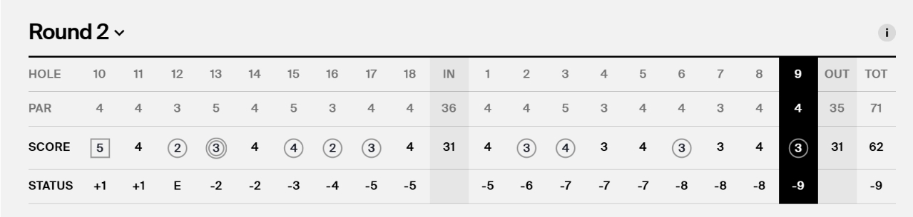 전날 8개월 만에 2오버파를 쳤던 셰플러는 아이언 샷이 살아난데 이어 그린주변에서 완벽한 플레이를 구사하며 3라운드를 기대케 했다. 셰플러는 올 시즌 아메리칸 익스프레스에서 우승하며 통산 20승을 달성했다.