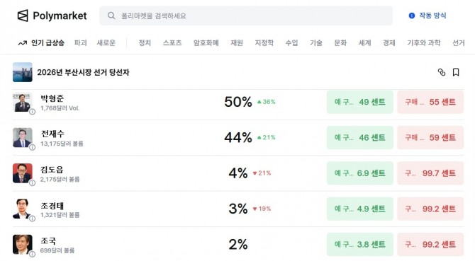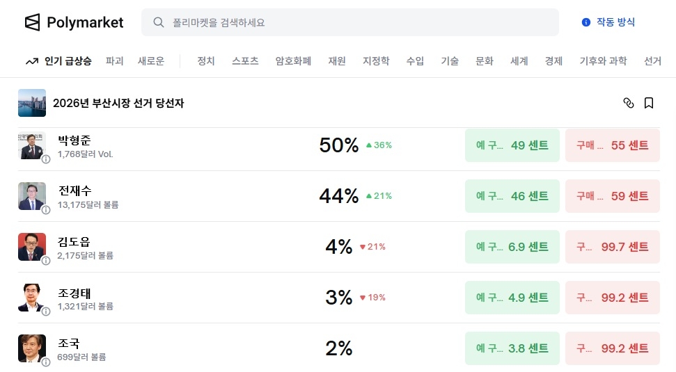 이미지 확대보기해당 항목은 ‘2026년 부산시장 선거 당선자 예측(Winner of 2026 Busan Mayor Election)’으로, 이용자들이 가상자산을 투입해 결과를 예측한다. 전통적 여론조사와 달리 표본·가중치 방식은 적용되지 않지만, 실제 자금이 투입된 선택의 집계라는 점에서 시장 참여자들의 기대치를 수치로 보여준다.