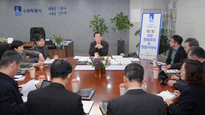 이미지 확대보기9일 시에 따르면, 이 시장과 김현수 제1부시장, 각 실·국장 등 간부 공직자들은 시장 집무실에서 ‘청렴행정 실천 서약식’을 갖고 청렴 실천 의지를 공식 선언했다.