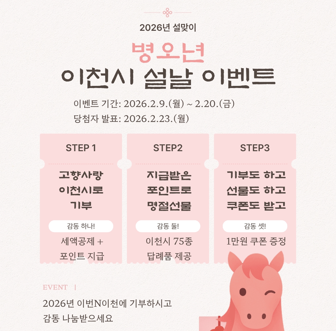 시는 임금님표 이천쌀과 지역 특산물, 가공품 등 이천의 정성이 담긴 답례품을 통해, 설 명절을 맞아 기부자에게 따뜻한 감사의 마음을 전한다는 취지이다. 이벤트 기간 중 기부자 가운데 추첨을 통해 50명에게 모바일 기프티콘을 증정해, 기부의 의미와 함께 명절의 즐거움을 더할 예정이다.
