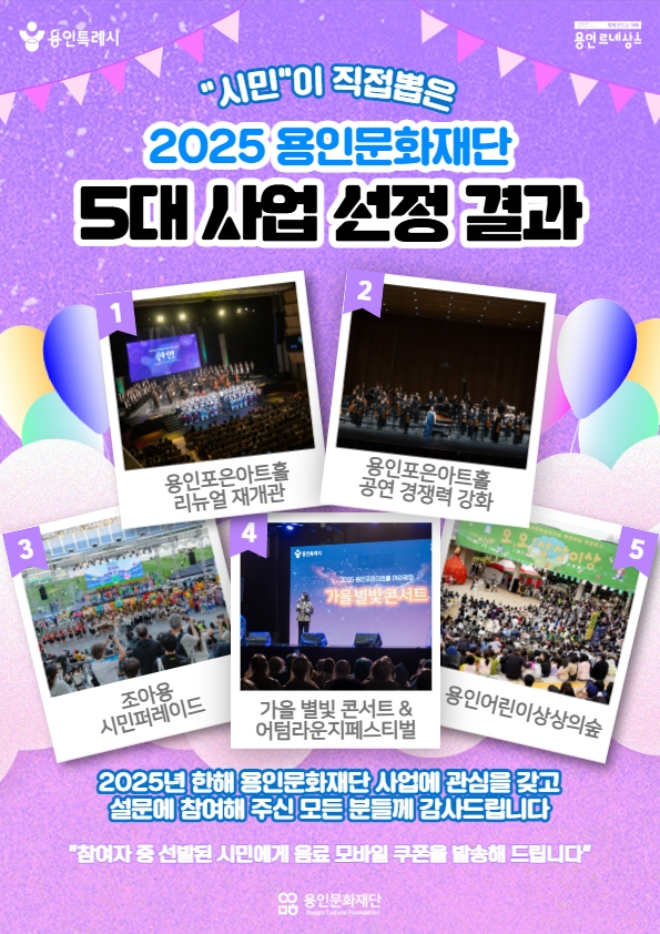 용인문화재단은 시민 투표 결과를 재단 누리집을 통해 공개하고, 시민이 직접 선정한 사업 성과를 향후 사업 운영과 홍보에 적극 반영해 시민 참여 기반 문화정책 운영을 강화하고, 시민 체감 중심 문화서비스 확대와 사업 개선을 위한 환류 체계를 지속적으로 구축해 나갈 방침이다.