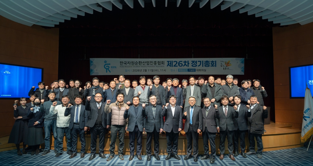 이미지 확대보기(사)한국자원순환산업진흥협회는 2026년 2월 11일 오전 11시 백범김구기념관 대회의실에서 민경보 협회장을 비롯해 이사 및 회원사 관계자, 산업통상부산업환경과 이상은 과장 등 약 70여 명이 참석한 가운데 제26차 정기총회를 개최했다고 밝혔다.