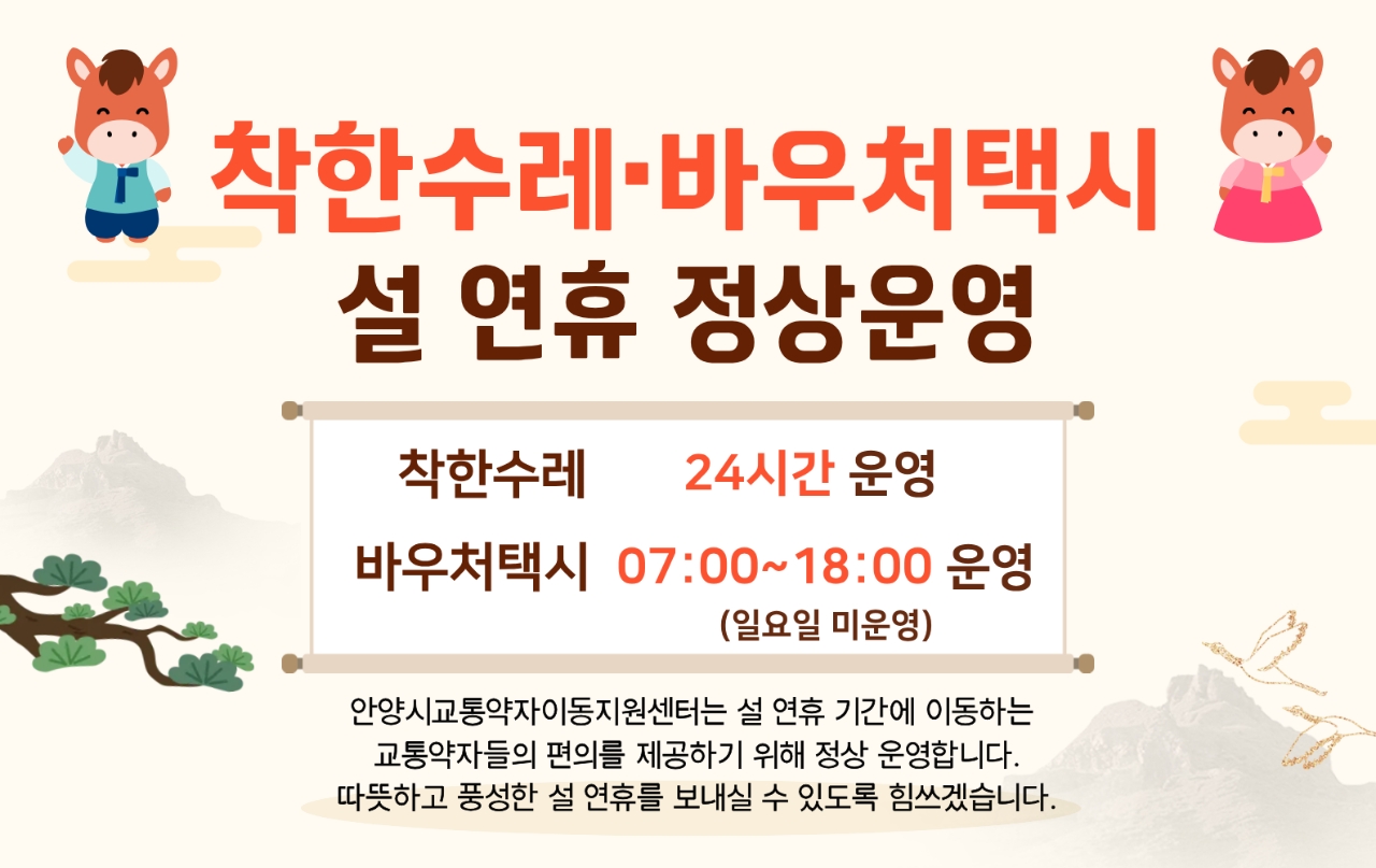 ‘착한수레’는 중증 보행 장애인과 휠체어 이용자 등 거동이 불편한 시민을 대상으로 하며, 현재 42대를 연중무휴 운영 중이다. 시는 올해 노후 차량 5대를 교체해 운행 안정성을 높일 계획이다. 이용 신청은 경기도 교통약자 광역이동지원센터 콜센터(1666-0420), 누리집, 모바일 앱을 통해 24시간 접수 가능하다.