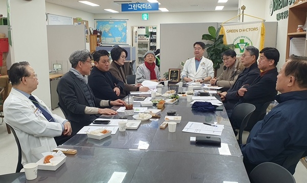 이미지 확대보기그린닥터스재단은 12일 오전 부산 부산진구 당감2동 온종합병원 내 사무실에서 정근 이사장을 비롯해 김승희 부이사장, 감로사 주지스님인 혜총 고문, 김동헌 온병원 병원장, 이한평 전 부산교통방송 대표, 윤경태 이사, 김백철 이사, 박명순 사무총장 등 그린닥터스 임원들이 참석한 가운데 개성병원추진위원회 월례회의를 개최하고, 북한에 의약품을 지원하기 위한 범국민 캠페인을 전개하기로 결정했다.