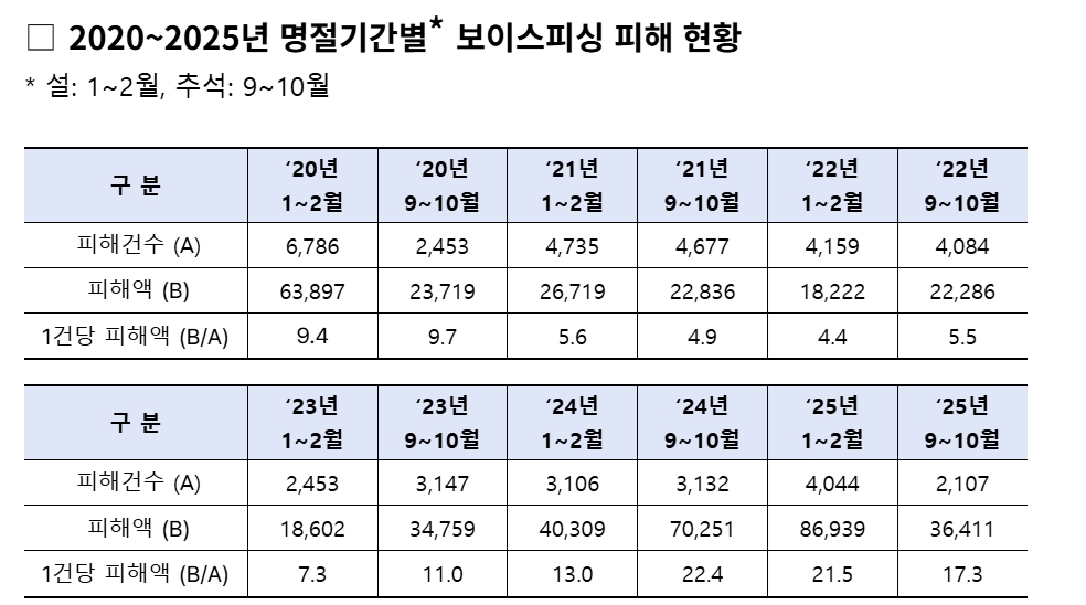 이미지 확대보기15일 국회 정무위원회 소속 이양수 의원(국민의힘)이 금융감독원으로부터 제출받은 자료에 따르면, 2020년부터 2025년까지 매년 명절 시즌(1~2월, 9~10월)에 발생한 보이스피싱 피해 건수는 총 4만 4883건, 누적 피해액은 4650억 원으로 집계됐다.