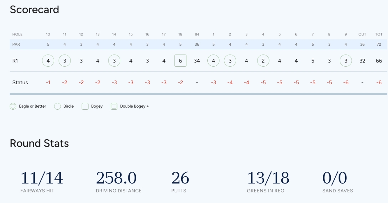 유해란(다올금융그룹)과 고진영(솔레어)은 이븐파 72타로 공동 48위, 김세영(SPORT ART)은 1오버파 73타로 공동 58위, 김아림(메디힐)은 2오버파 74타 공동 62위에 머물렀다.