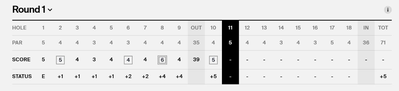통산 20승에 이 대회와 인연이 없는 셰플러는 10번홀까지 버디 없이 보기 3개, 더블보기 1개로 5오버파를 쳐 출전 72명 중 공동 71위로 '꼴찌'다.