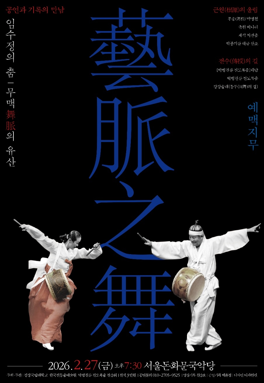 무맥(舞脈)의 유산 '예맥지무'는 ‘춤을 보고. 춤을 읽다.’라는 표제어를 내건다. 공연 외에도 기록물을 만난다. 찰나의 예술을 넘어. 기록으로 기억되는 특별한 공연 기획이 눈에 띈다. 35년의 숨결. '박병천류 진도북춤'(민속원, 2026년 1월 초판 발행)의 맥(脈)과 무대의 감동이 번져온다. “장단과 음률이 몸에 차오르고 그리했을 때. 자연스럽게 우러나오는 것이 춤이다.”라고 했던 스승의 가르침, 그 춤사위를 좇은 임수정 명무의 일생이 한 권의 책에 담겼다.