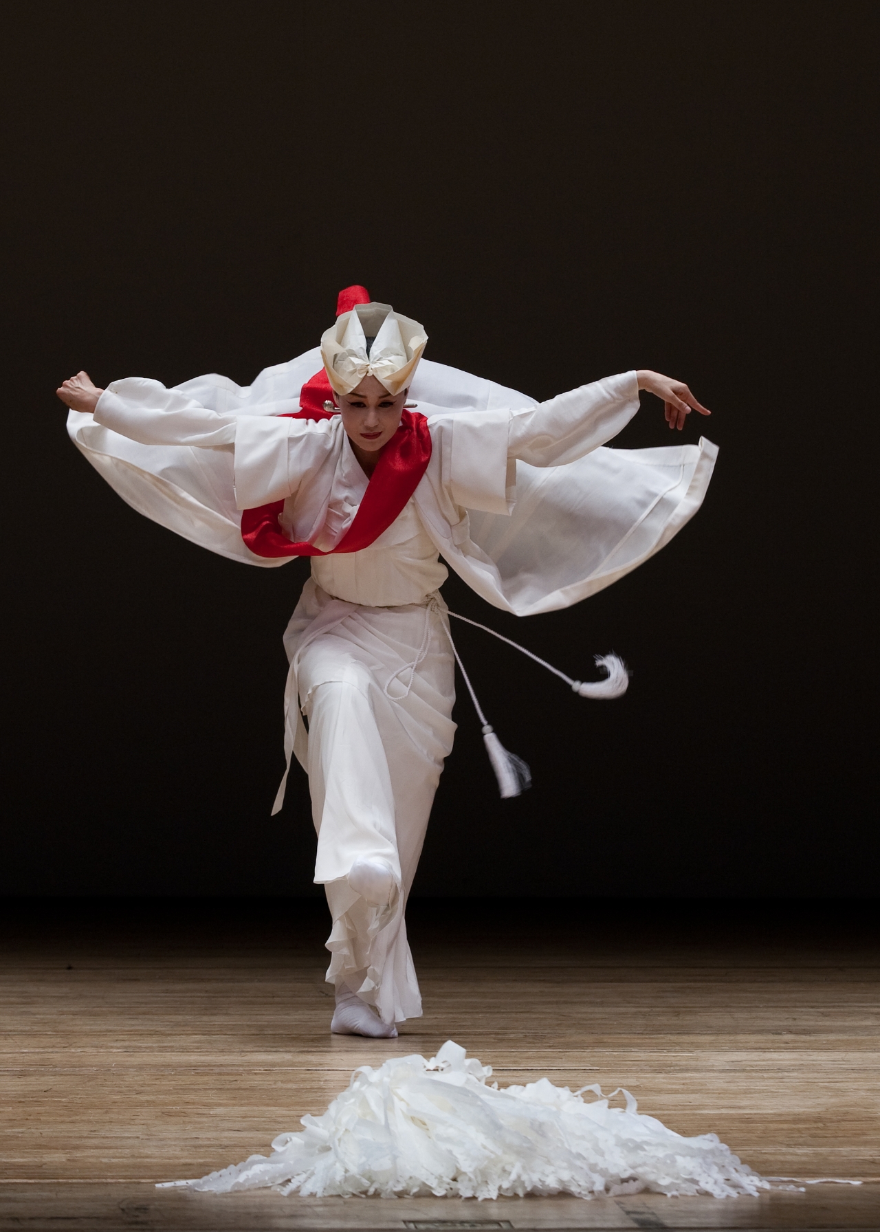 이미지 확대보기임수정의 '예맥지무'에서 전통은 생명을 지닌 듯 끊임없이 되살아나는 ‘대를 잇는 예술혼’이라는 주제를 중심에 담는다. 전통은 현재를 미래로 잇는 흐름에서 전통춤은 제자의 몸에 기억으로 흡수되고, 또 다시 다음 세대로 전승된다. 가무악(歌舞樂)의 예인(藝人) 故 무송(舞松) 박병천(朴秉千, 1933∼2007), 시대의 명인이 남긴 전통 춤사위. 박병천 선생의 ‘호흡’, 제자의 ‘몸짓’, 새로운 세대의 ‘감각’이 한 무대에서 만나 전통춤은 형태가 아닌 혼(魂)으로 계승된다