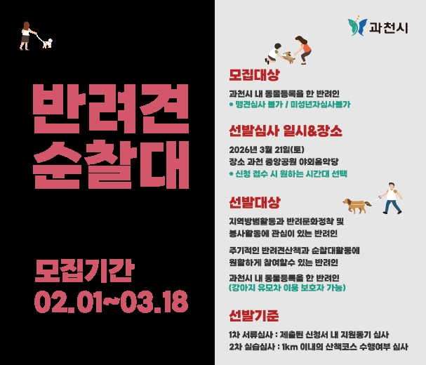 신계용 과천시장은 “반려견 순찰대는 주민이 주도적으로 우리 동네의 안전을 지키는 뜻깊은 활동”이라며, “반려견과 함께 산책도 즐기고 지역 사회에 봉사할 수 있는 이번 모집에 시민 여러분의 많은 관심과 참여를 부탁드린다”고 전했다.