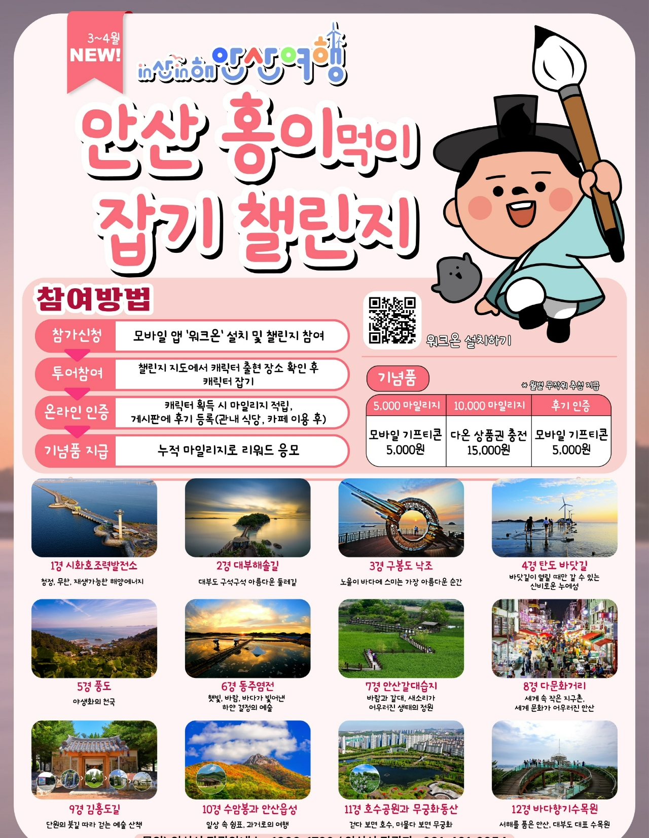 이미지 확대보기이번 챌린지는 모바일 앱을 통해 안산시 곳곳에 나타나는 캐릭터를 수집하는 게임형 관광 프로그램이며 총 2회차로 나뉘어 진행되며, 1회차(3~4월)는 ‘안산12경’을 주제로, 2회차(5~6월)는 ‘걸으며 만나는 안산’을 테마로 걷기 좋은 길을 소개할 예정이다.