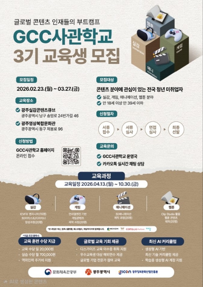 이미지 확대보기GCC사관학교는 광주시와 문화체육관광부, (재)광주정보문화산업진흥원이 운영하는 문화콘텐츠 전문 인재 양성 플랫폼으로, 현장 중심 교육과 기업 연계 프로그램을 통해 실무형 콘텐츠 인재를 체계적으로 육성하고 있다.