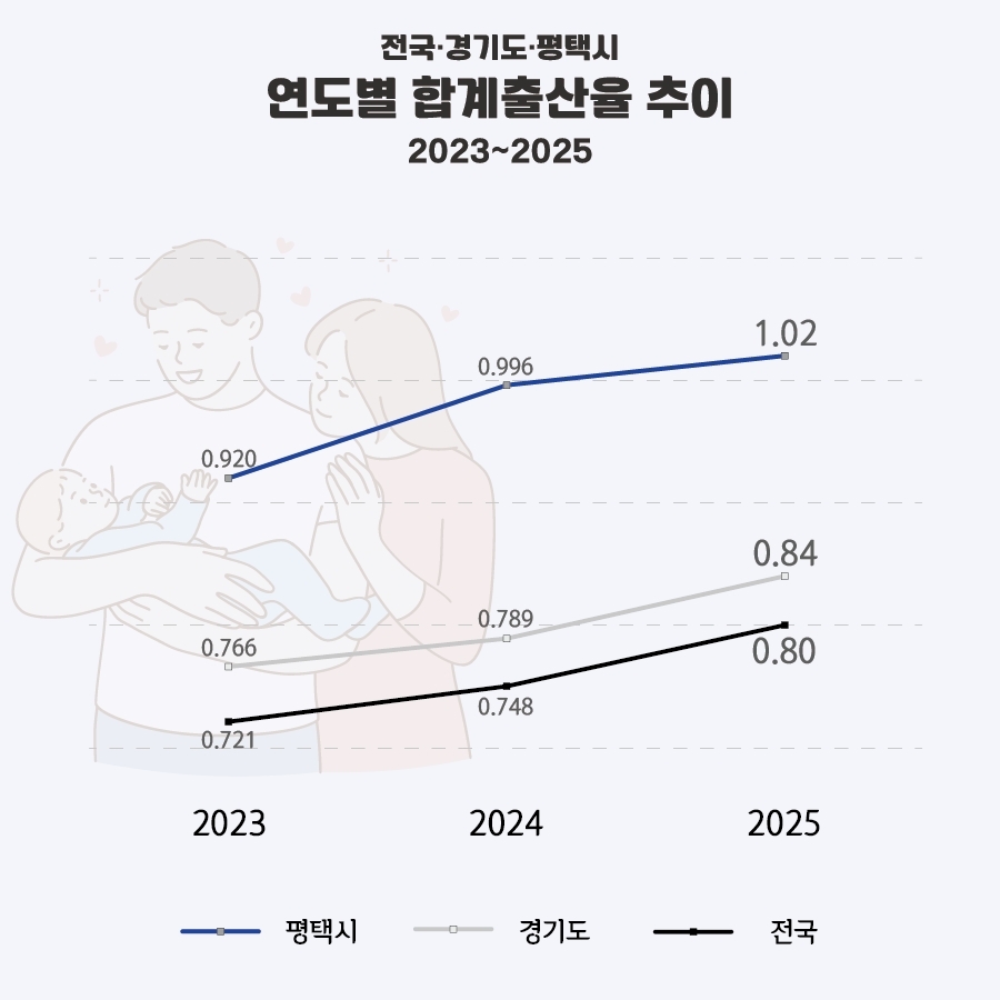 이미지 확대보기국가데이터처가 발표한 2025년 잠정 합계출산율에 따르면 평택시는 2024년 0.996에서 2025년 1.02로 상승했다. 이는 2023년 0.92 이후 2년 연속 오름세를 보이며 출산 지표 개선 흐름을 유지했다.