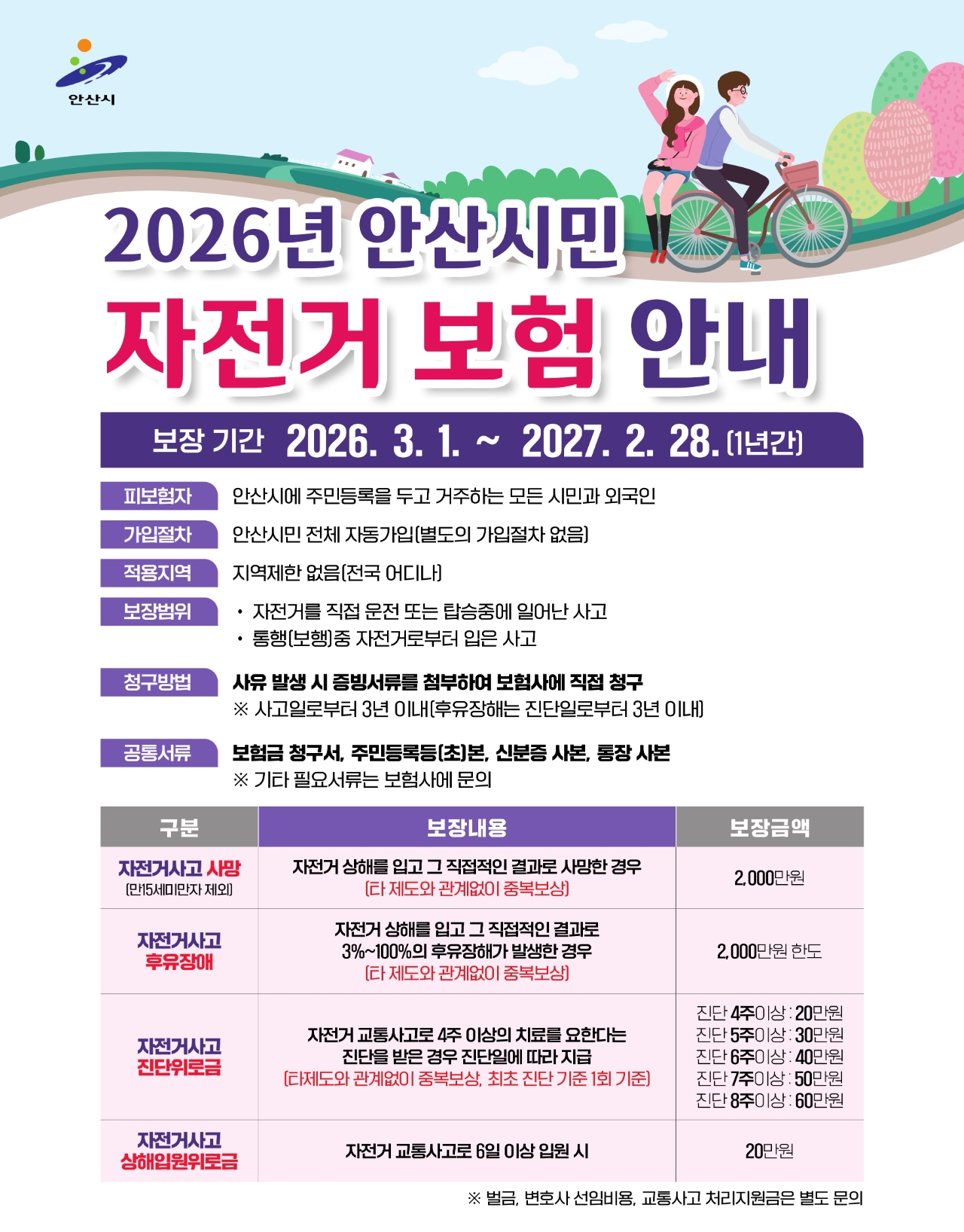 이미지 확대보기‘안산시민 자전거보험’은 지난 2018년부터 시행 중인 제도로, 관내에 주민등록을 두고 거주하는 시민(외국인 포함)이라면 별도의 가입 절차 없이 자동으로 적용된다.