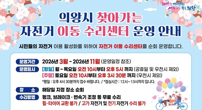 자전거 이동 수리센터는 이달부터 11월까지 각 동 주민센터 등 지정된 장소를 순회하며 운영된다. 운영시간은 평일 오전 10시부터 오후 5시 30분까지이며, 우천 시에는 운영하지 않는다.