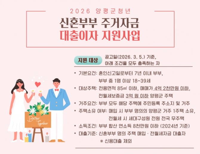 지원 대상은 공고일인 3월 5일 기준 △혼인 기간 7년 이내로 양평군에 거주하는 신혼부부(부부 중 1명 이상 18~39세 청년) △부부 합산 연소득 8천만 원 이하(2024년 기준) △전용면적 85㎡ 이하이면서 매매가 4억2천만 원 이하 또는 전월세 보증금 3억 원 이하 주택 등 요건을 충족해야 한다.