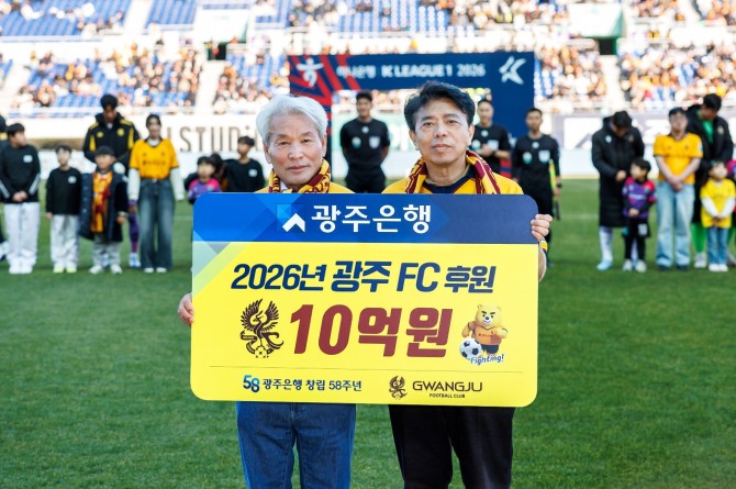 이미지 확대보기광주은행(은행장 정일선)은 지난 7일 광주월드컵경기장에서 열린 광주FC 홈 개막전에서 후원금 전달식을 갖고 지역 대표 구단인 광주FC에 2026 시즌 후원금 10억 원을 전달했다고 9일 밝혔다.