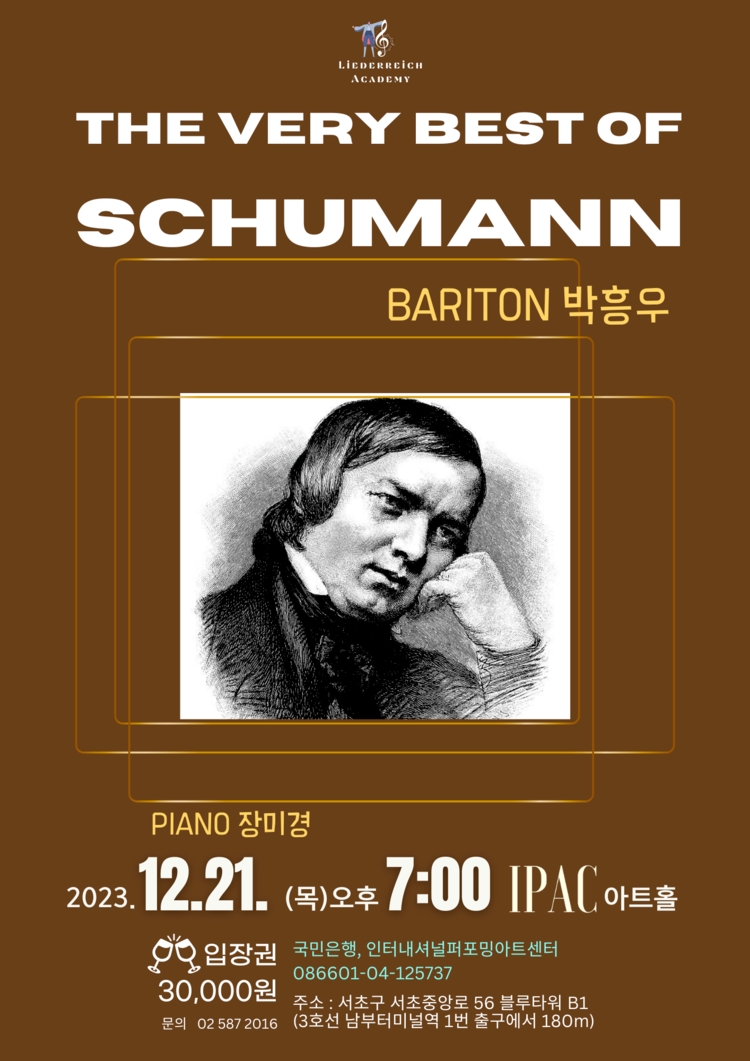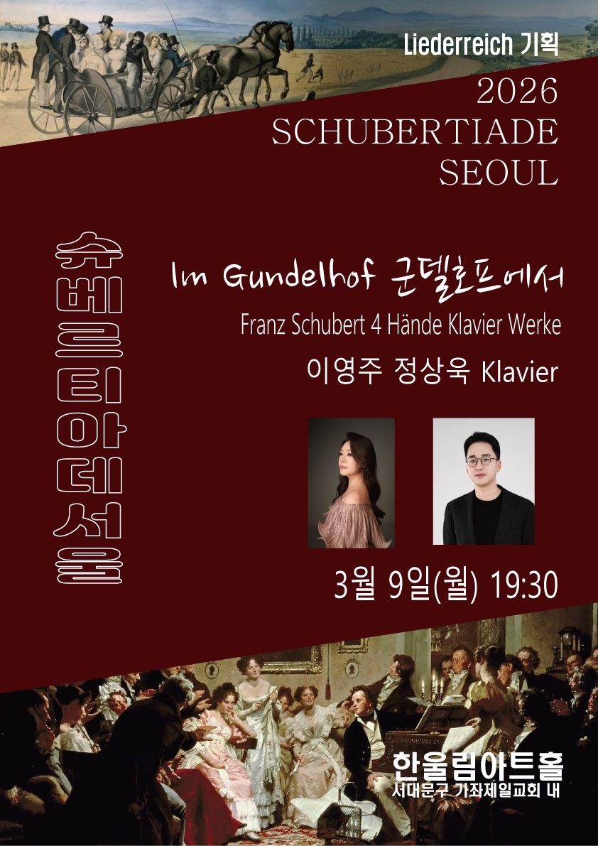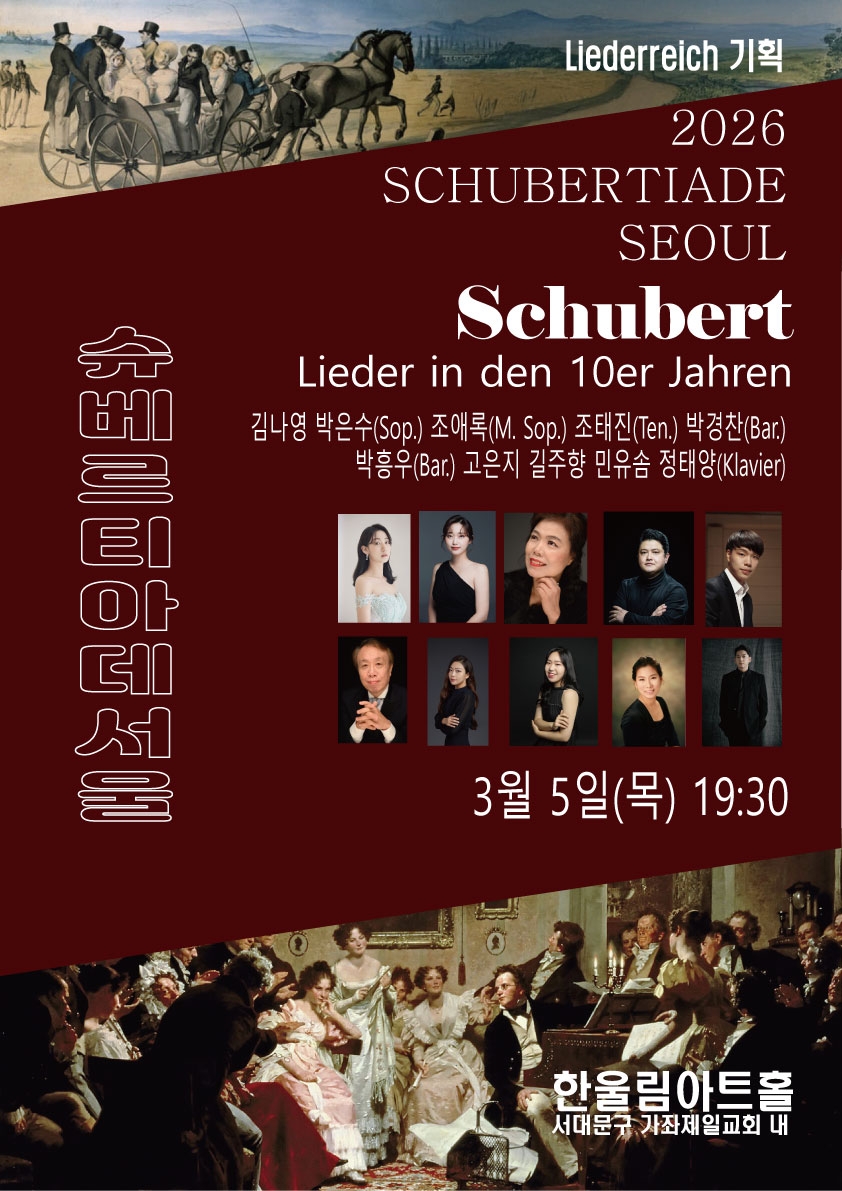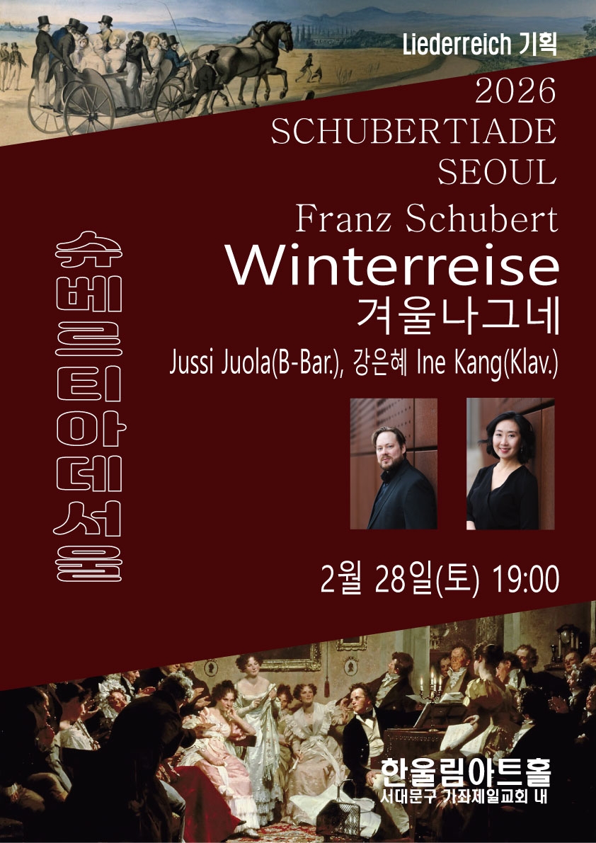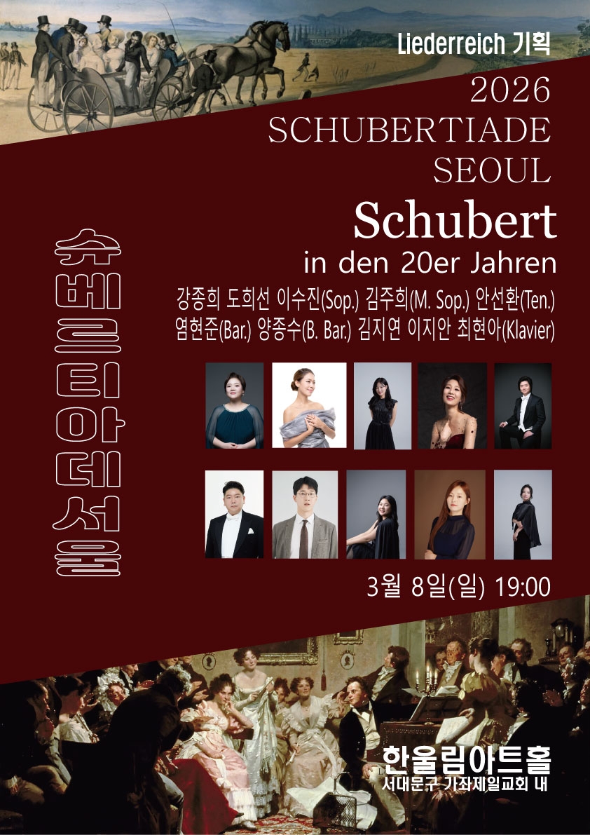이미지 확대보기병오년이 오자 리더라이히는 슈베르트의 3대 연가곡을 포함한 총 7회의 특별한 공연 슈베르티아데를 준비했다. 슈베르티아데는 19세기 빈에서 시작된 사랑방 같은 음악 살롱으로, 슈베르트의 가곡과 실내악을 감상하던 행사다. 슈베르티아데 서울은 이 고귀한 전통을 재현하며, 독일 가곡의 깊은 예술적 가치를 전한다. 연주곡은 슈베르트의 연가곡 ‘아름다운 물방앗간의 아가씨’(바리톤 박흥우 20곡), ‘겨울나그네’(베이스 바리톤 유씨 유올라 24곡), ‘백조의 노래’(박흥우 7곡, 유씨 유올라 7곡=14곡) 및 ‘슈베르트, 봄에 울리다’(피아노 솔로 4곡, 듀오 3곡), ‘10대의 슈베르트’(16곡 가운데 박흥우 3곡), ‘20대의 슈베르트’(25곡), ‘군델호프에서’(이영주 정상욱, 피아노 4곡)로 구성되었다.