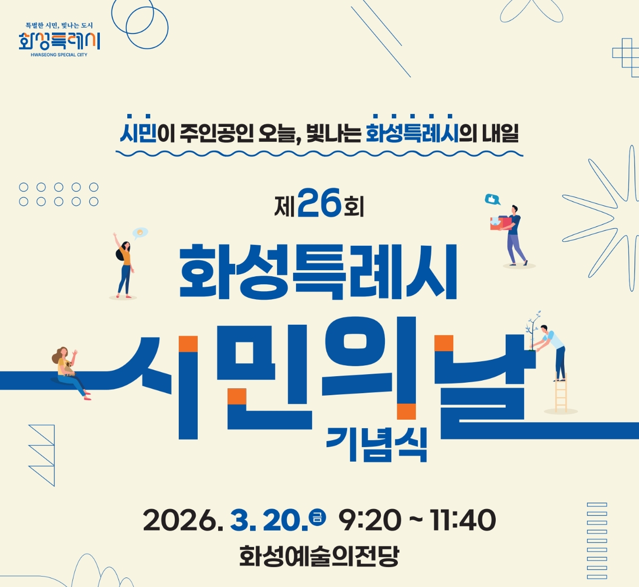 ‘제26회 화성특례시민의 날’ 기념식은 오는 20일 오전 10시 화성예술의전당에서 열린다. ‘시민이 주인공인 오늘, 빛나는 화성특례시의 내일’을 슬로건으로 시민 참여형 행사로 진행된다.