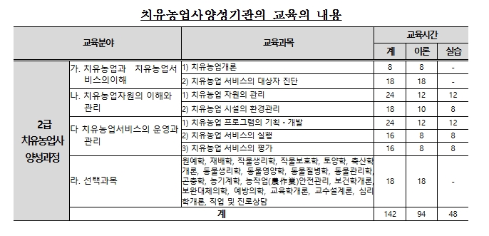이번 교육은 오는 4월 4일부터 8월 8일까지 총 142시간 과정으로 진행된다. 교육 과정은 △치유농업과 치유농업서비스의 이해 △치유농업 자원의 이해와 관리 △치유농업서비스 운영 관리 등 이론과 실습 교육으로 구성됐다.