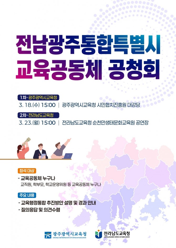 공청회는 18일 오후 3시 광주시민협치진흥원 대강당과 23일 오후 3시 전남 순천만생태문화교육원에서 두 차례에 걸쳐 진행된다. 공청회에서는 △교육행정통합 추진방안 설명 및 추진 경과 안내 △교육공동체 질의응답 △교육공동체 의견 수렴 등이 주요 내용으로 다뤄질 예정이다.