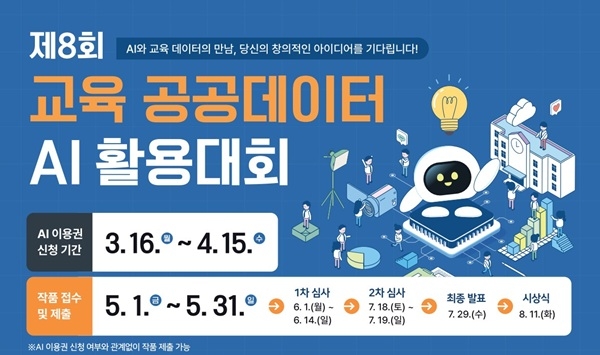 이미지 확대보기‘교육 공공데이터 AI활용대회’는 교육부와 17개 시·도 교육청이 공동으로 주최하는 대회로 교육 공공데이터에 대한 국민적 관심을 높이고 데이터 이용을 활성화하는 한편, AI 기술과 교육 데이터를 접목한 실용적인 서비스 아이디어 발굴을 목적으로 치러진다.