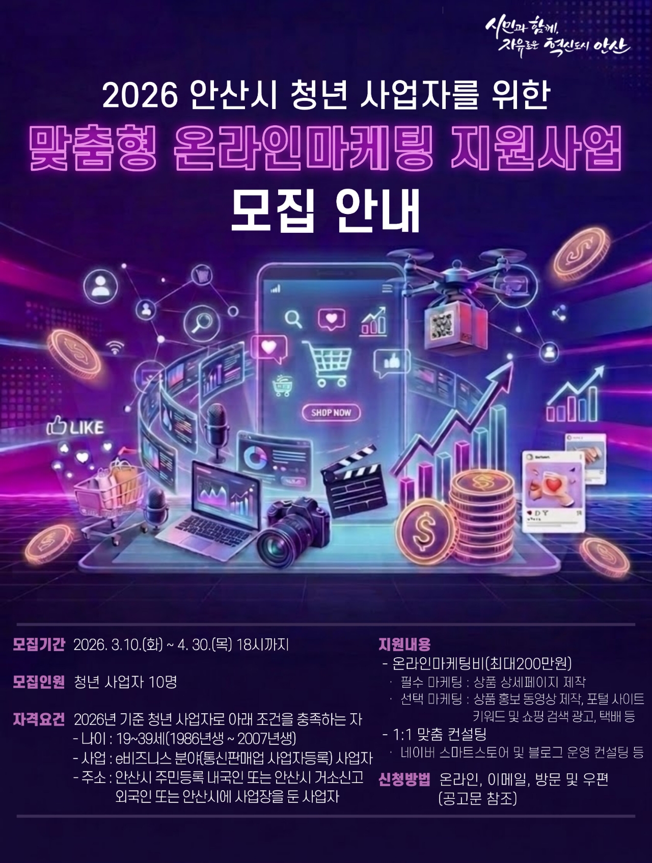 신청 대상은 관내에 거주하거나 사업장을 둔 19~39세 청년 사업자이며, 통신판매업으로 사업자 등록을 완료해야 한다.