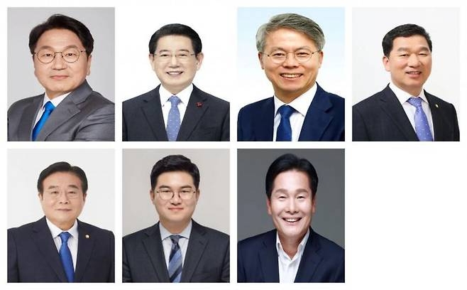 강기정 광주시장(위 왼쪽부터), 김영록 예비후보(전남지사 직무 정지), 민형배 국회의원, 신정훈 국회의원. 이병훈 더불어민주당 호남특위 상임수석부위원장(아래 왼쪽부터 ), 정준호 국회의원, 주철현 국회의원. 사진=더불어민주당 광주광역시당