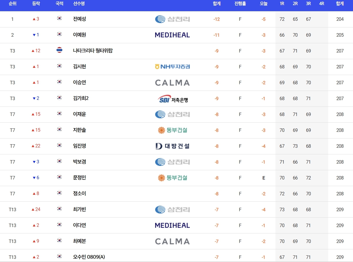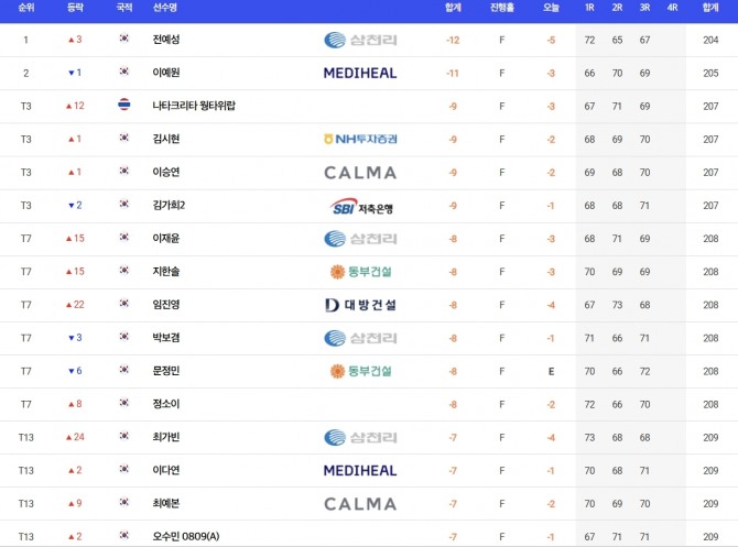전예성은 이날 버디 6개, 보기 1개로 5타를 몰아쳐 합계 12언더파 204타를 쳐 스마트한 플레이에 능한 이예원을 1타 차로 제치고 단독 선두에 나섰다.