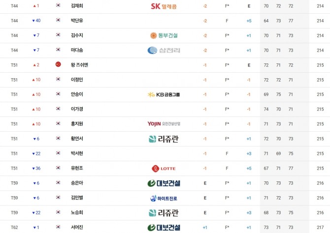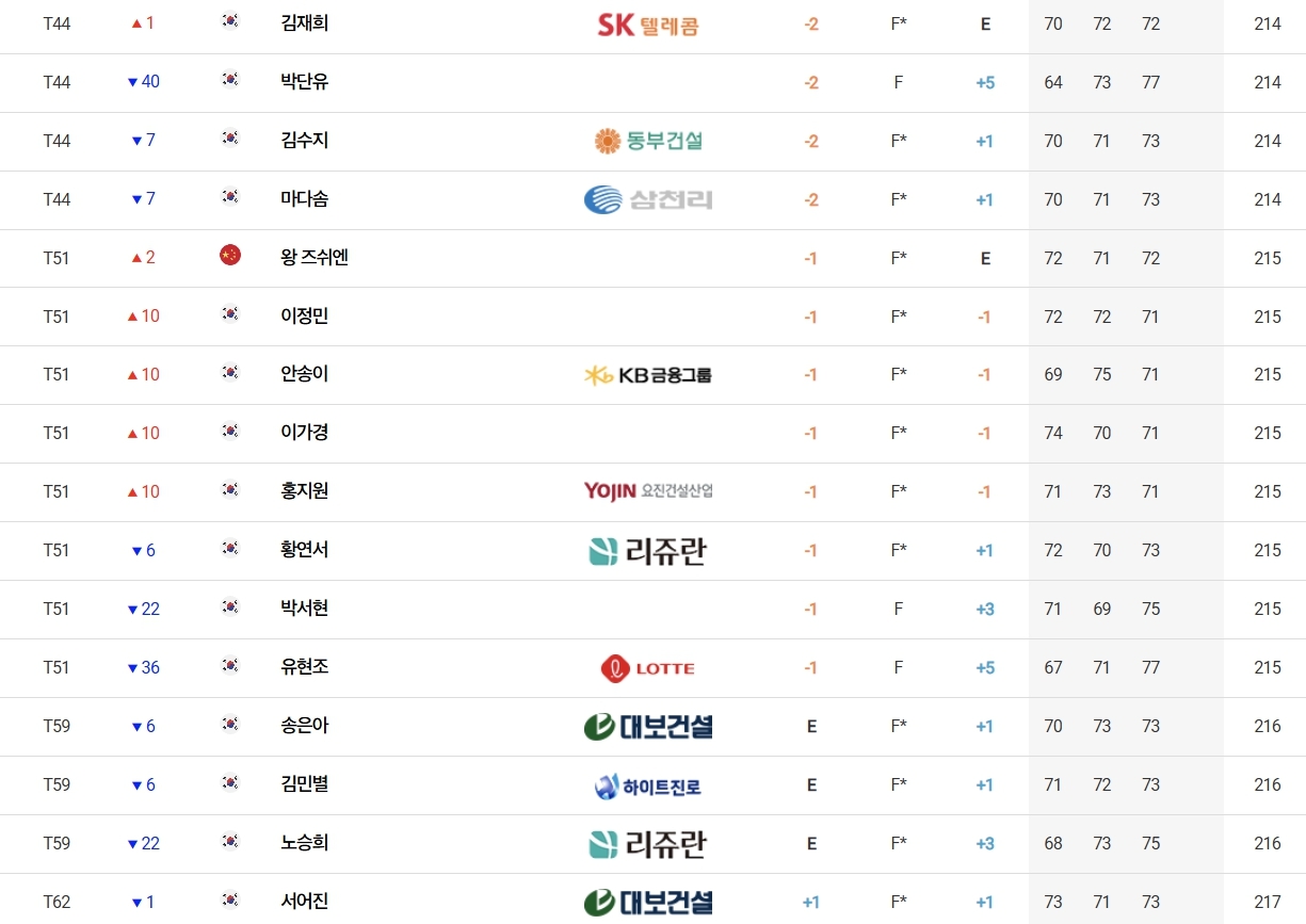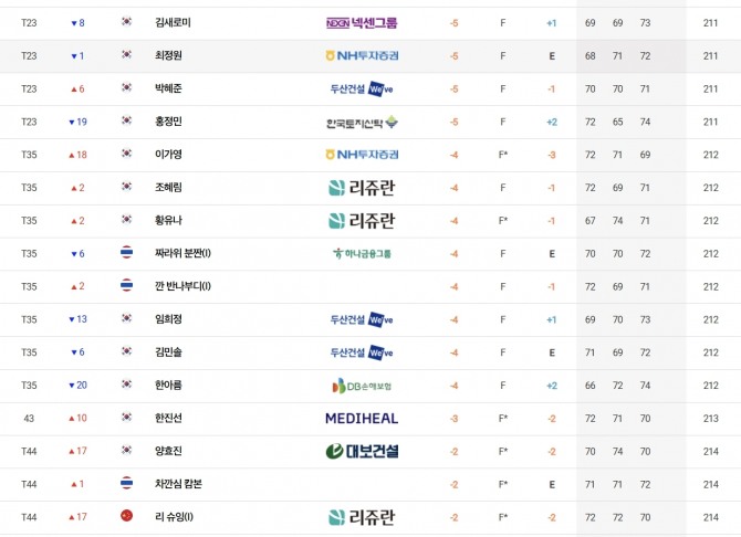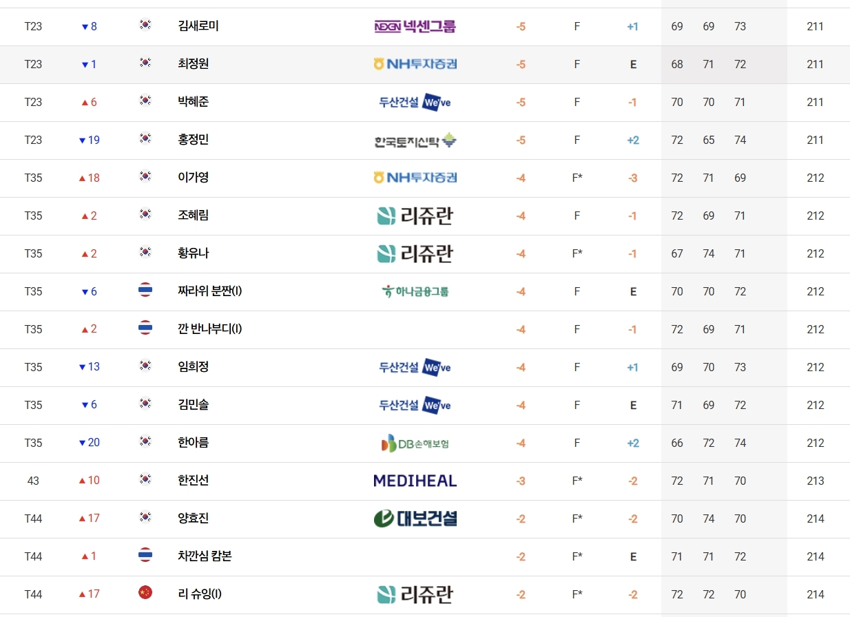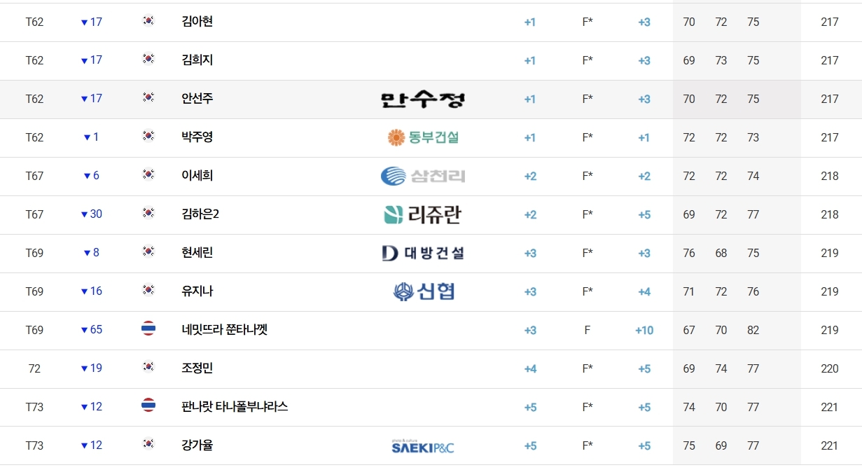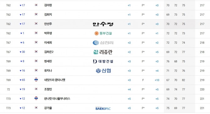 첫날 신바람을 일으켰던 한아름(DB손해보험)은 2, 3라운드에서 타수를 줄이지 못해 합계 4언더파 212타로 임희정(두산건설 위브), 김민솔(두산건설 위브) 등과 공동 35위에 그쳤다.