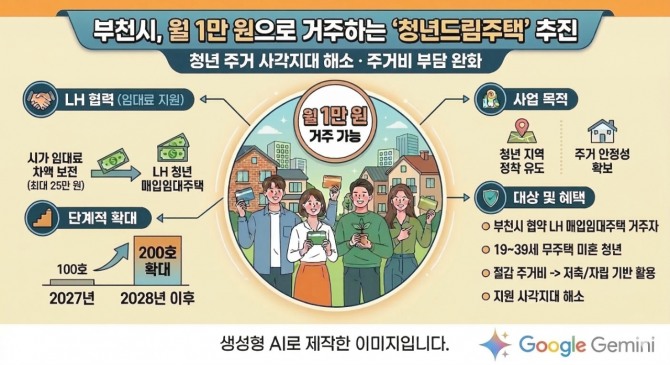 대상은 부천시 내 LH 청년매입임대주택에 거주하는 19세~39세 무주택 미혼 청년이며, 경제적 여건·거주기간·지역 내 근무 여부 등을 종합 평가해 선정할 예정이다. 주거급여 수급 탈락자 등 지원 사각 대상에게 가산점을 부여하는 방안도 함께 논의 중이다. 내년부터 100호를 대상으로 시범사업을 추진한 뒤, 2년 차부터는 200호까지 규모를 점진적으로 확대할 방침이다.