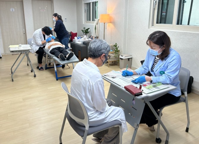 지난 해 5월 28일 보건소 의료진이 노인케어안심주택을 방문해 구강검진 등 맞춤형 건강관리 서비스를 제공하고 있다. 사진=안산시