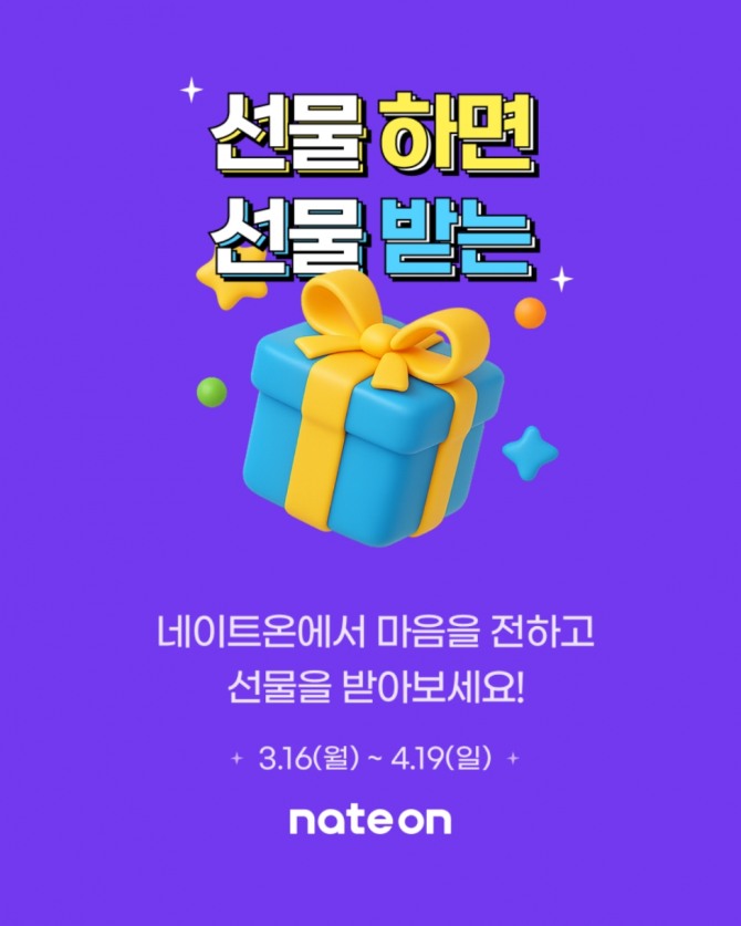 이미지 확대보기네이트커뮤니케이션즈(대표 이종성)는 일상과 커머스를 잇는 ‘선물하기’ 기능 오픈 등 서비스 대개편을 기념해, 네이트온 사용자들에게 풍성한 혜택을 제공하는 대규모 감사 이벤트를 오늘 16일부터 4월 19일까지 한 달간 진행한다고 16일 밝혔다.
