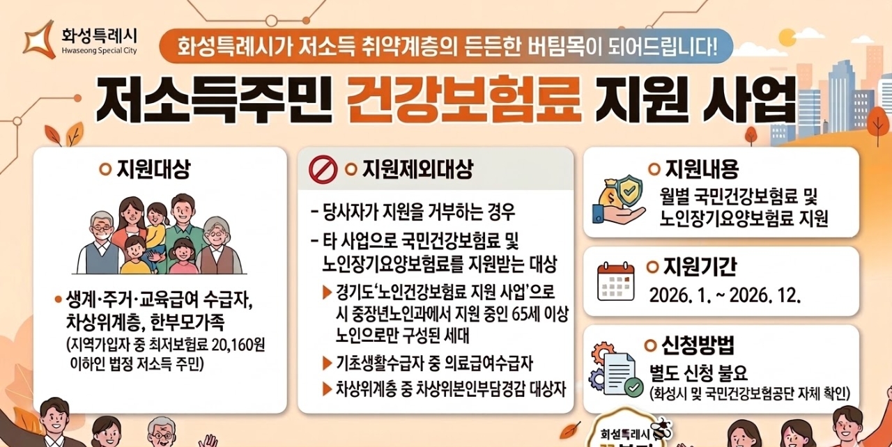 지원 대상은 지역가입자 가운데 최저보험료 이하를 납부하는 생계·주거·교육급여 수급자, 차상위계층, 한부모가족 등으로, 해당 가구에는 건강보험료와 노인장기요양보험료 전액이 지원된다.
