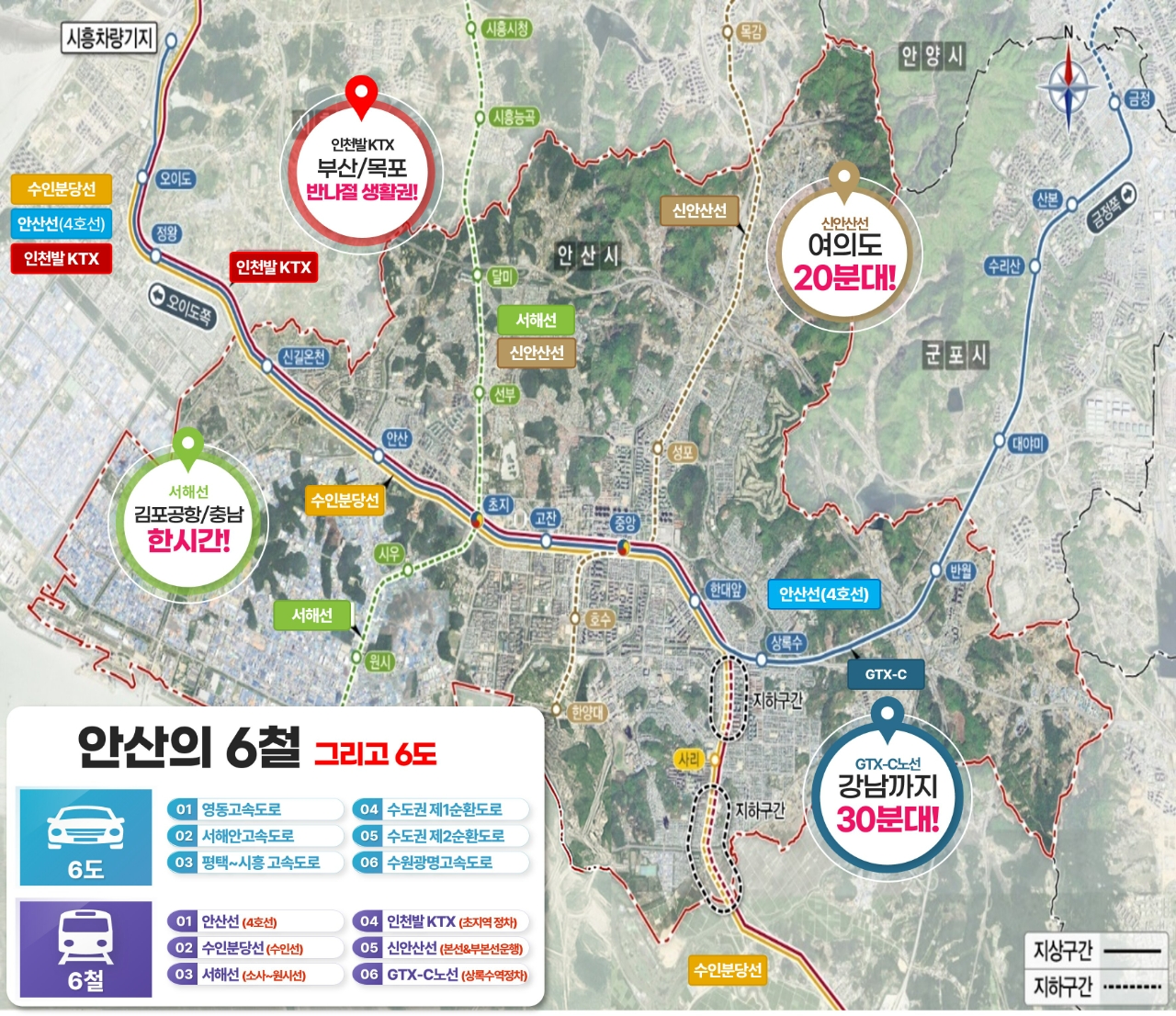 이미지 확대보기안산시는 이 같은 6개 도로와 6개 철도망을 중심으로 한 ‘6도 6철’ 체계를 통해 교통 중심 도시로의 전환을 가속화한다는 방침으로 △영동고속도로 △서해안고속도로 △평택~시흥고속도로 △수도권제1순환도로 △수도권제2순환도로 △수원광명고속도로 등 6개 주요 도로와 △안산선 4호선 △신안산선 △GTX-C △인천발 KTX △수인분당선 △서해선 등 6개 철도망을 중심으로 교통체계를 구축하고 있다.