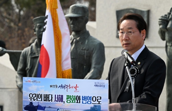 유정복 시장은 기념사를 통해 “유난히 시리고 아픈 가슴을 부여잡고 계실 서해 55용사 유가족에게 깊은 위로와 경의를 표한다”며, “앞으로도 인천시는 보훈이 문화가 되고 일상이 되는 ‘호국보훈의 도시 인천’의 위상을 더욱 확고히 세워 나가겠다”라고 말했다.