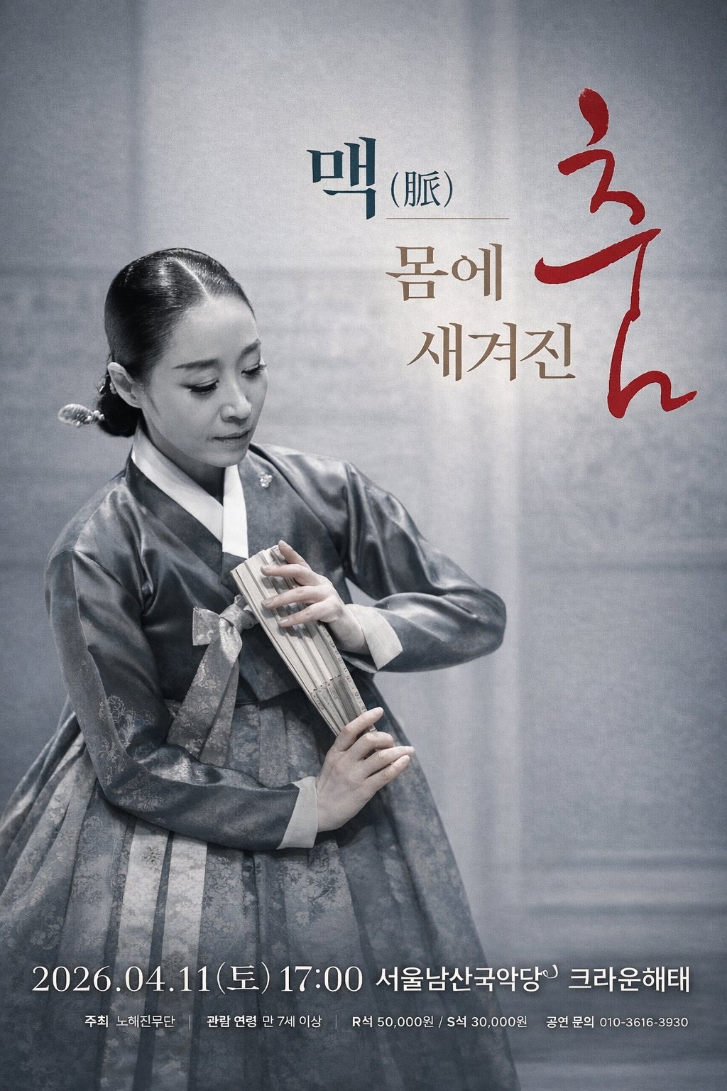 이미지 확대보기노해진은 “새로움은 근본에서 멀어지는 것이 아니라, 몸에 새겨진 춤을 오늘의 숨으로 다시 꺼내는 일”이라고 말한다. '맥(脈)-몸에 새겨진 춤'은 전통춤의 깊이와 현대적 감각이 만나는 지점에서, 지금의 몸으로 전통을 다시 세우는 무대가 된다. 노해진의 개인 공연은 차별화된 전통춤의 품격을 소지한다. 오랜 수련과 치열한 사유에서 비롯된 예술적 깊이가 무대 전반에 스며들어, 관객에게 전통춤의 새로운 가치와 미학을 선명하게 각인시키기 때문이다.