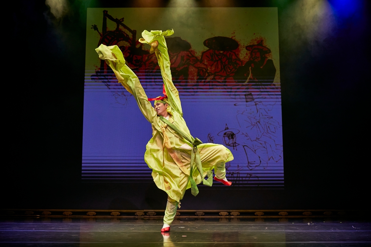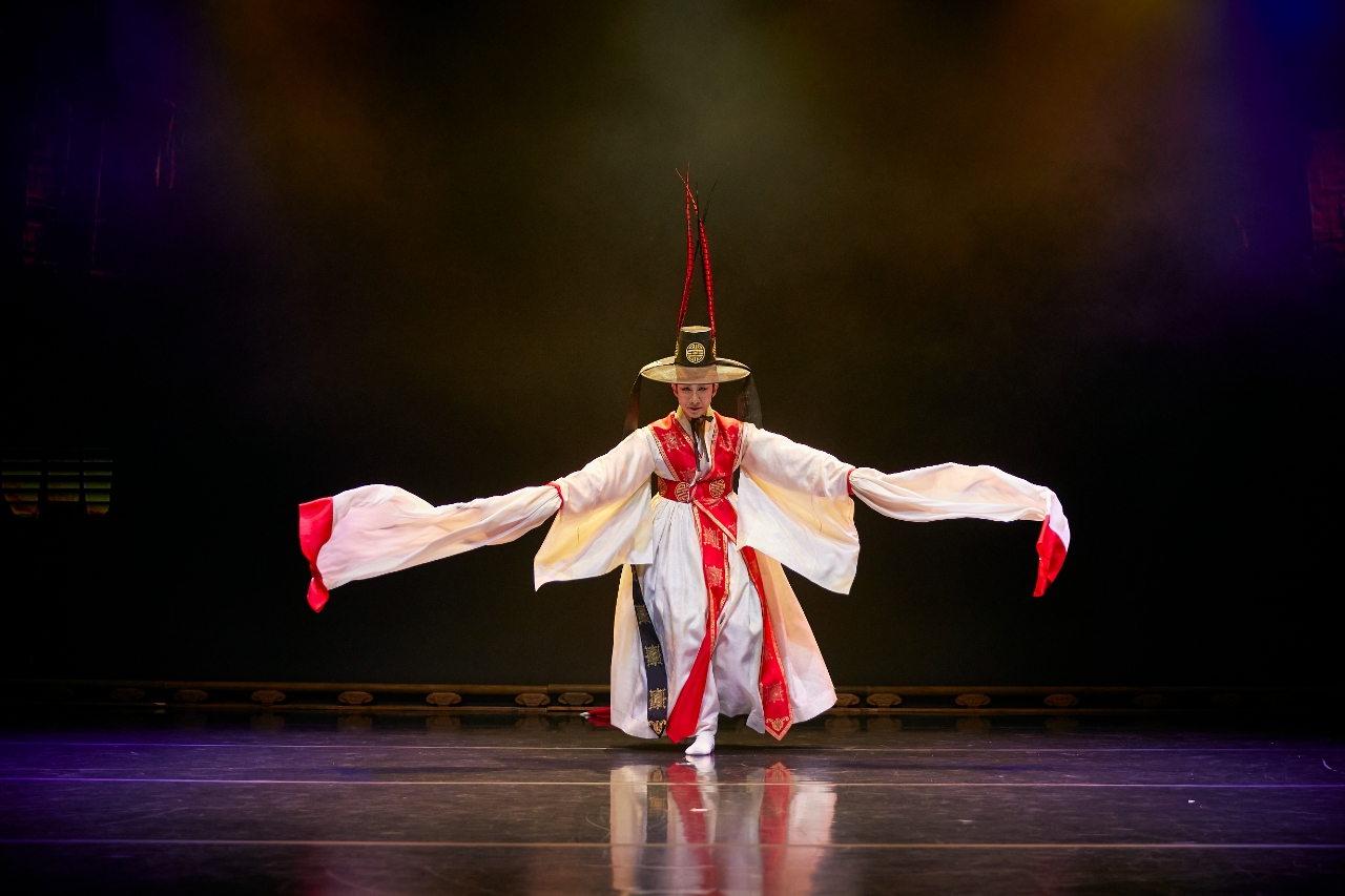 ‘화랭이 춤’(唱夫舞, 출연: 유재성): 경기 도당굿을 총괄하는 남자 무당을 화랭이라 한다. 생로병사의 순환을 축원, 축수하면서 청신, 가래조, 축귀에 이르는 의례의 흐름을 엮어내며 신과 인간의 경계를 잇는다. 국태민안 기원의 큰굿에서부터 마을의 안녕과 복덕을 비는 축원굿까지 도당굿은 호방한 남성적 기운으로 일관된다. 굿판의 정기와 리듬을 바탕으로 국수호가 빚어낸 이 춤은 화랭이의 다층적 존재성과 장단의 결을 미학적으로 응축한 무대로 승화된다.