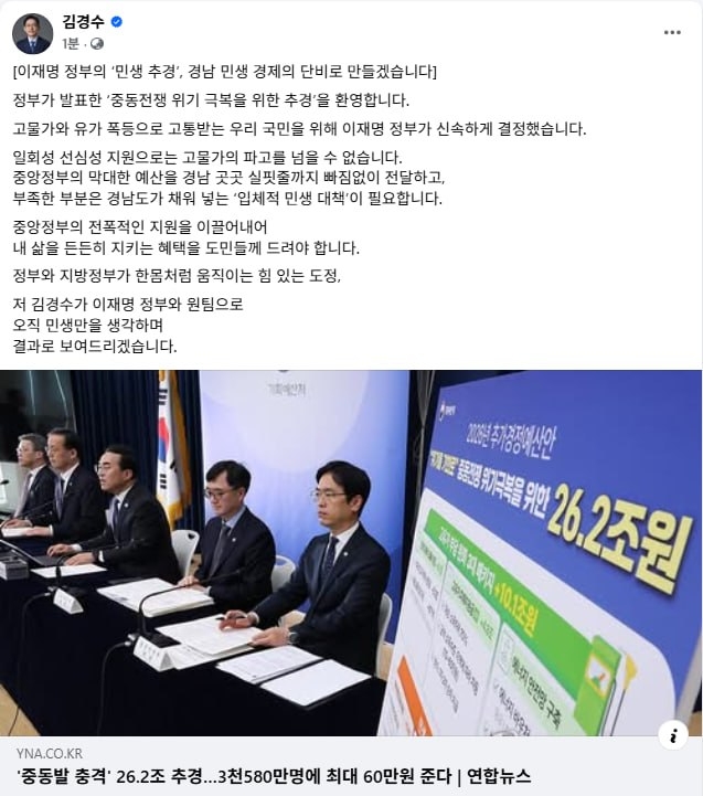김 후보는 "정부가 발표한 '중동전쟁 위기 극복을 위한 추경'을 환영한다"면서 "고물가와 유가 폭등으로 고통 받는 우리 국민을 위해 이재명 정부가 신속하게 결정했다"고 평가했다.