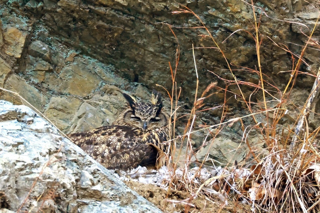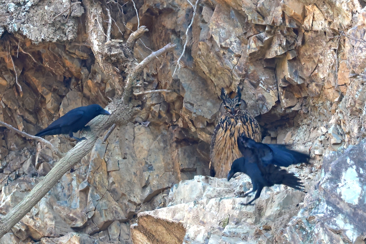 이미지 확대보기울산시에 따르면, 시민생물학자인 윤기득 사진작가는 지난 1월부터 3월 중순까지 울주군 주거지 인근 절개지 바위틈에 둥지를 튼 수리부엉이 한 쌍과 새끼 4마리를 지속적으로 관찰했다. 해당 서식지는 지난해 처음 확인됐으며, 올해 1월 초 포란 장면이 목격되면서 본격적인 관찰이 시작됐다. 이후 2월 말 부화에 성공했고, 현재 새끼들은 어미의 보호 아래 이소를 앞두고 있다.