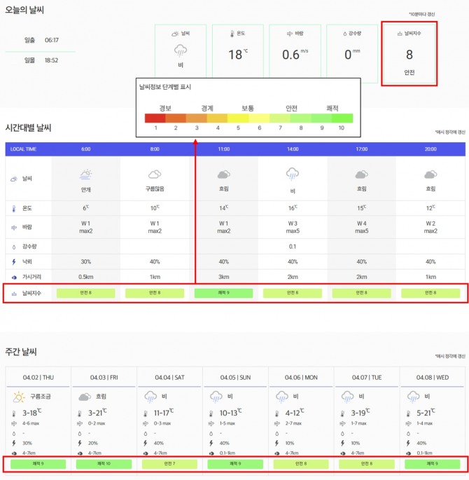 날씨 지수는 기온, 강수, 풍속, 낙뢰, 자외선, 시야, 대기질, 습도 등 총 8개 항목을 균등 가중 방식으로 분석해 산출한다. 오전 6시부터 오후 6시까지 경기 시간 동안 3시간 단위로 총 4회 최신 날씨 정보를 제공한다.