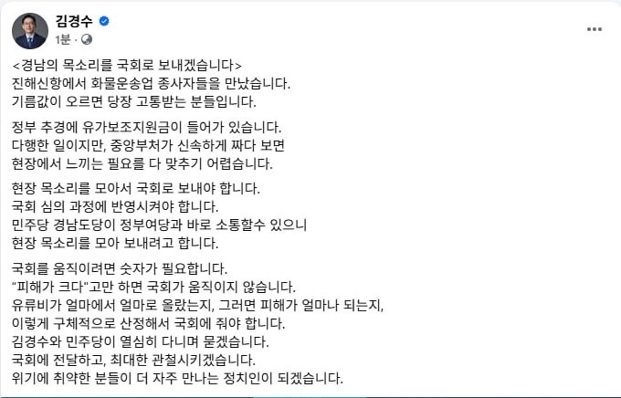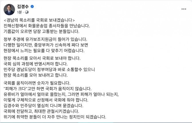이어 "유류비가 얼마에서 얼마로 올랐는지, 피해가 얼마나 되는지, 구체적으로 산정해서 국회에 올려야 한다"며 "김경수와 민주당이 열심히 다니며 묻겠다"고 적었다.