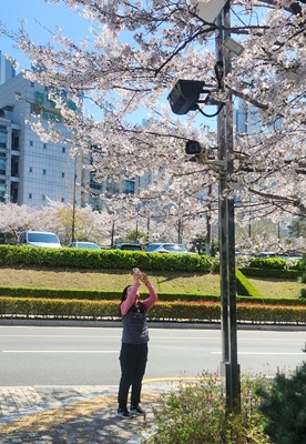한 시민이 부산 연제구 부산지방국세청 길가에 핀 벚꽃을 카메라에 담기 위해 여념이 없다. 사진=강세민 기자