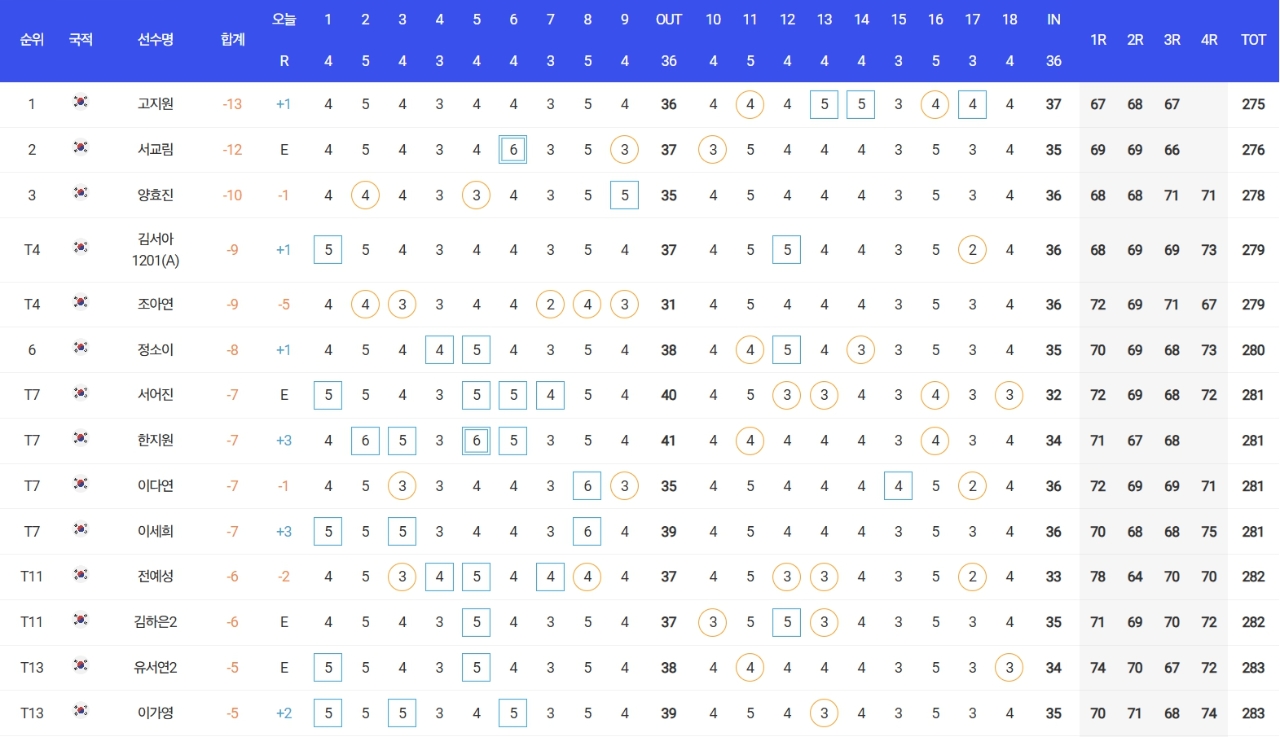 고지원은 10번홀까지 파행진을 벌인 고지원은 10번홀(파5)에서 버디를 챙기며 승기를 잡았으나 13번홀(파4)과 14번홀(파4)에서 연속 보기를 범하며 불안했다. 그러다가 16번홀 버디로 스코어를 원점으로 되돌렸다.