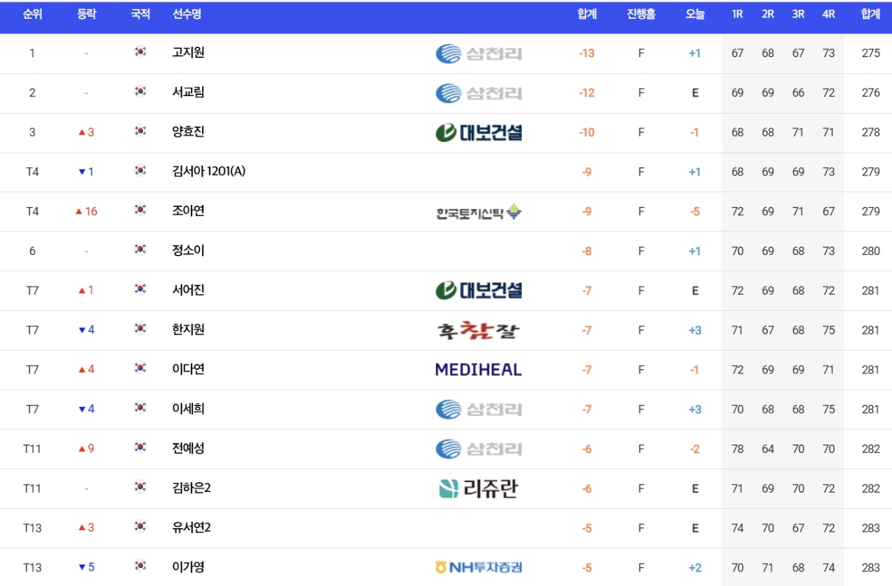 A. 오늘 라운드를 제외하면 3라운드까지는 정말 만족스러울 정도로 샷 감이 좋았다. 거의 100%에 가깝게 만족할 정도였다. 오늘은 긴장을 많이 해서 아쉬운 부분이 있었지만, 전반적으로는 매우 좋았다.