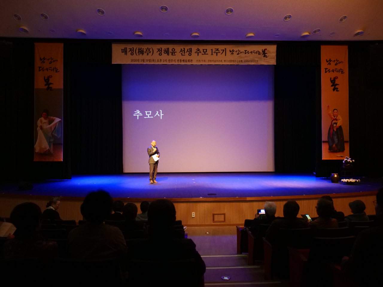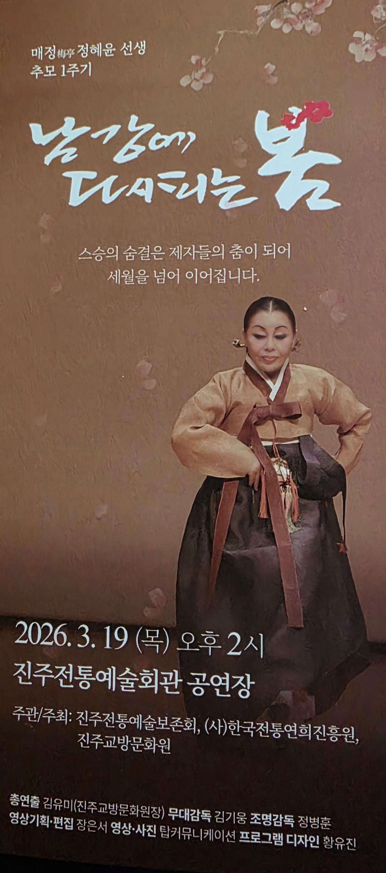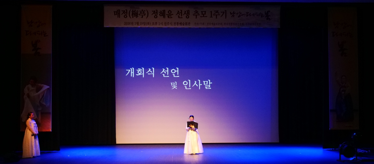 이미지 확대보기지난달 19일(목) 오후 2시, 진주전통예술회관 공연장에서 매정(梅亭) 정혜윤 선생 추모 1주기 기념, 진주전통예술보존회·(사)한국전통연희진흥원·진주교방문화원 주관·주최, 김유미(진주교방문화원장) 총연출의 '남강에 다시 피는 봄'이 공연되었다. 음력 이월 초하루의 남강 변에는 온갖 꽃들이 봄을 알리고 있었고, 공연장 주변에도 가득 훈기가 번지고 있었다. 후학들은 '스승의 숨결은 제자들의 춤이 되어 세월을 넘어 이어집니다'라는 표제어로 다짐을 보여주었다. 유족 대표 한국전통연희진흥원 박규하 대표이사는 기념공연 진행에 세심하게 배려하고 후원했다.
