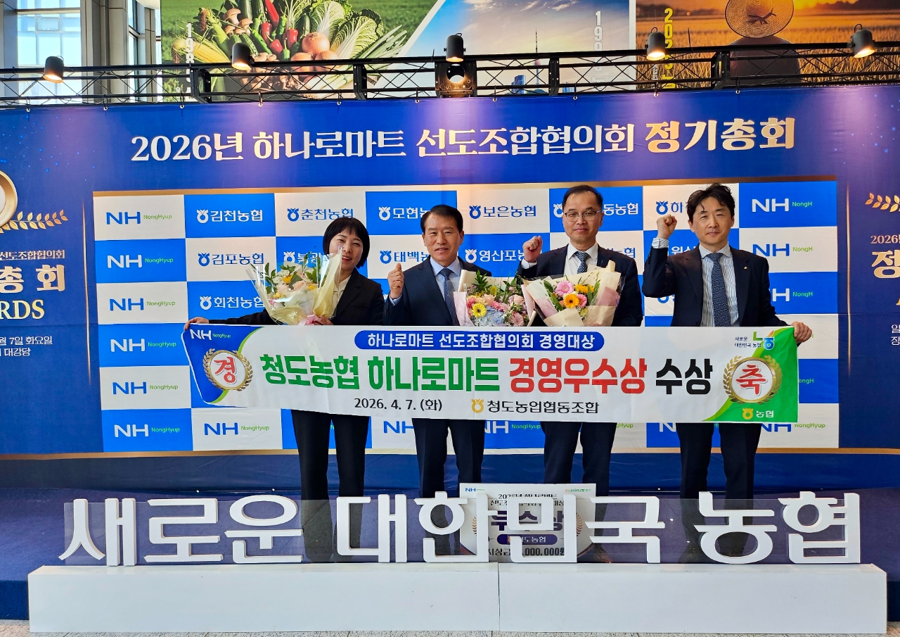 이미지 확대보기청도농협(조합장 이재희)은 7일 농협중앙회에서 열린 ‘2026년 하나로마트 선도조합협의회 정기총회’에서 하나로마트가 경영우수상을 수상했다고 밝혔다.