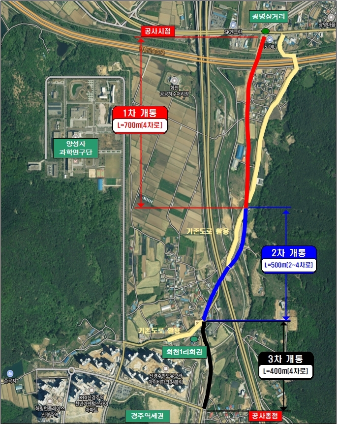 해당 도로는 광명삼거리에서 화천1리회관을 거쳐 신경주역세권으로 이어지는 주요 간선도로로, 선형 개선을 통해 차량 흐름이 한층 원활해질 것으로 기대된다. 특히 양성자과학연구단을 비롯한 인근 산업 및 연구시설 접근성이 크게 개선되면서 지역 경제 활성화에도 긍정적인 파급 효과가 예상된다.